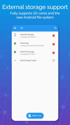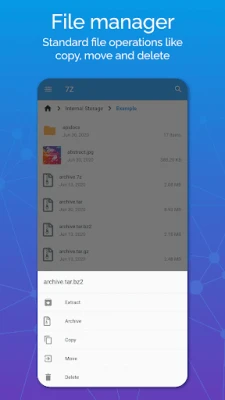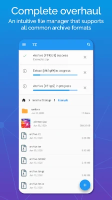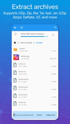 7Z lets you take control of archive files like 7Zip (7z format) zip, rar, jar or APK on your device. Quickly and easily extract, open, view or create your own archive by compressing files and folders.