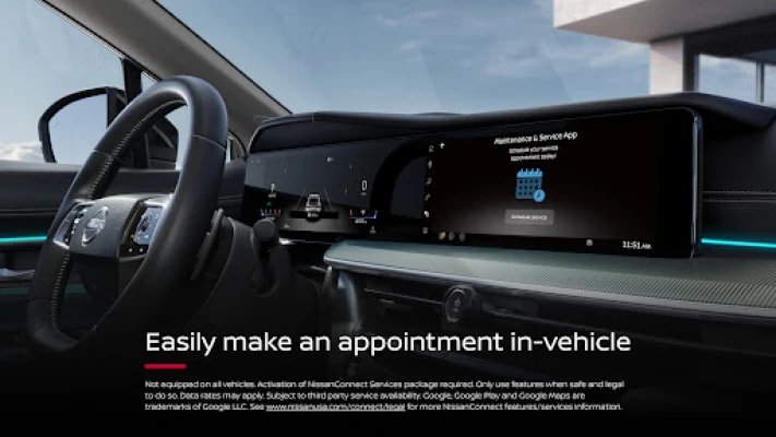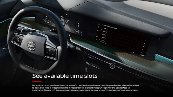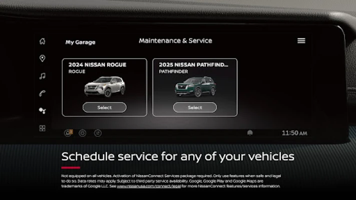 *Feature availability varies by vehicle model year, model, trim level, packaging and options. Consumer activation of NissanConnect Services SELECT package ("Package") required. Package trial period included with eligible new vehicle purchase or lease. Trial period may be subject to change or termination at any time and without notice. After trial period ends, monthly subscription fee required. Driving is serious business and requires your full attention. Only use features when safe and legal to do so. Never program while driving. GPS mapping may not be detailed in all areas or reflect current road status. Connectivity service required. App subscriptions may be required. Data rates may apply. Subject to third party service availability. Should such service providers terminate or restrict service or features, service or features may be suspended or terminated without notice or with no liability to NISSAN or its partners or agents. Google, Google Play and Google Maps are trademarks of Google LLC. For more information, see www.nissanusa.com/connect/legal.