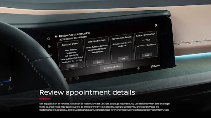 With the available in-vehicle Nissan Service app*, you can easily schedule an appointment directly from your vehicle infotainment screen at your preferred Nissan Dealer or search for nearby Nissan Dealers. Regularly scheduled service appointments with your local Nissan Dealer help to keep your vehicle running smoothly.
