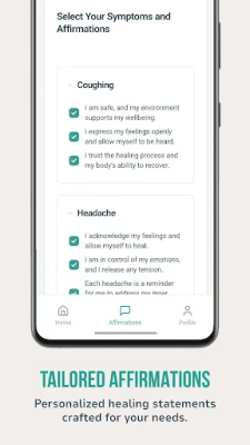 • Healing Affirmations: Use custom affirmations tailored to your emotional needs for stress relief, to support healing and emotional balance.